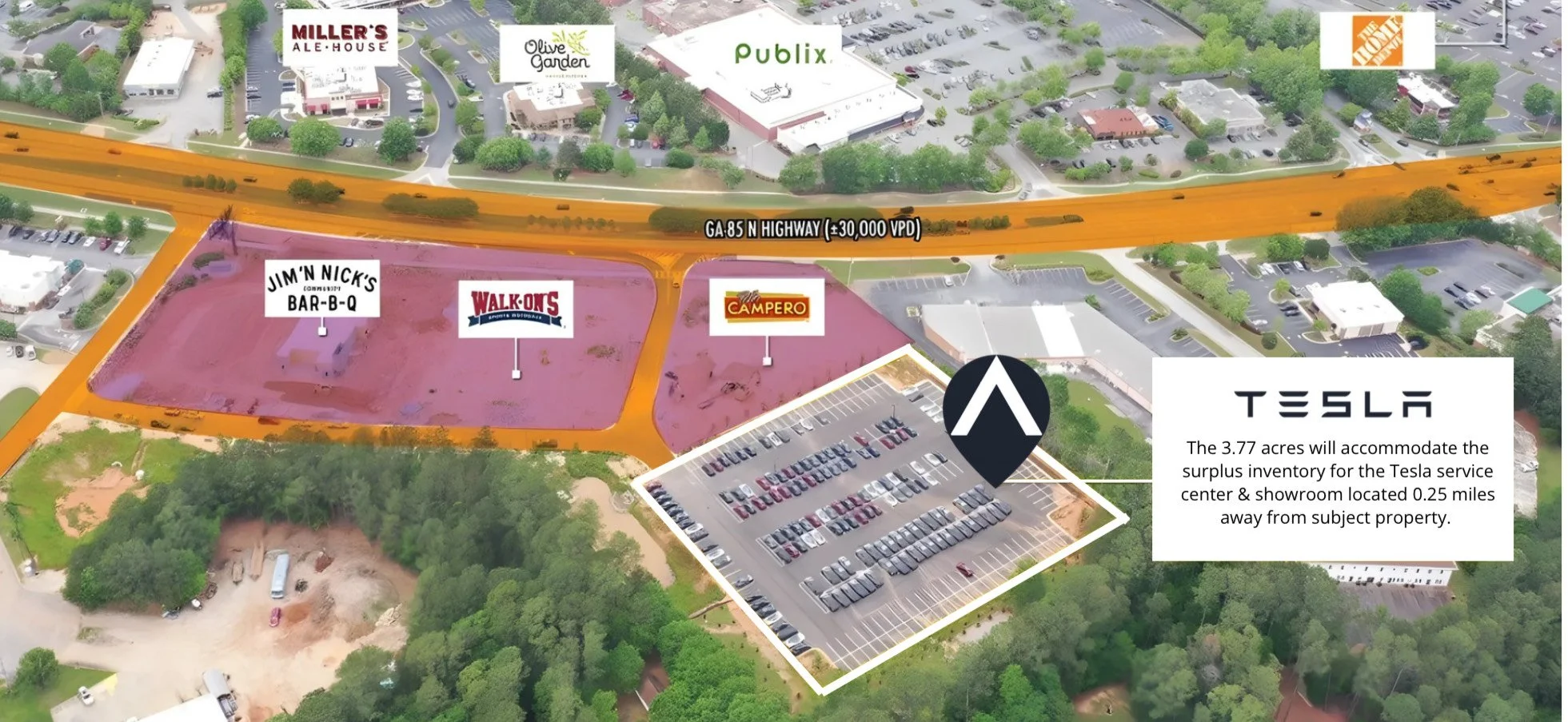 The site serves as surplus vehicle inventory for Tesla’s nearby showroom and service center, just a quarter mile away, and sits along GA-85 N (±30,000 VPD) directly across from Fayette Pavilion, Georgia’s largest open-air shopping center with 4.7M annual visitors.