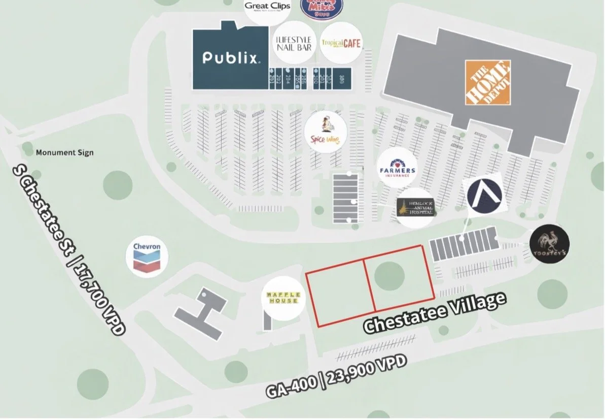 Situated at the intersection of GA Highway 400 and State Route 60, Chestatee Village is in a high-traffic area with approximately 40,000 vehicles passing daily.